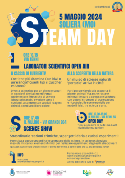 Domenica 5 maggio a Soliera c’è lo STEAM day. Un intero pomeriggio rivolto ai bambini, dedicato alla magia della scienza, alle discipline STEAM (Science, Technology, Engineering, Art, Mathematics) e al metodo scientifico, che insegna come rispondere alle curiosità attraverso la sperimentazione.